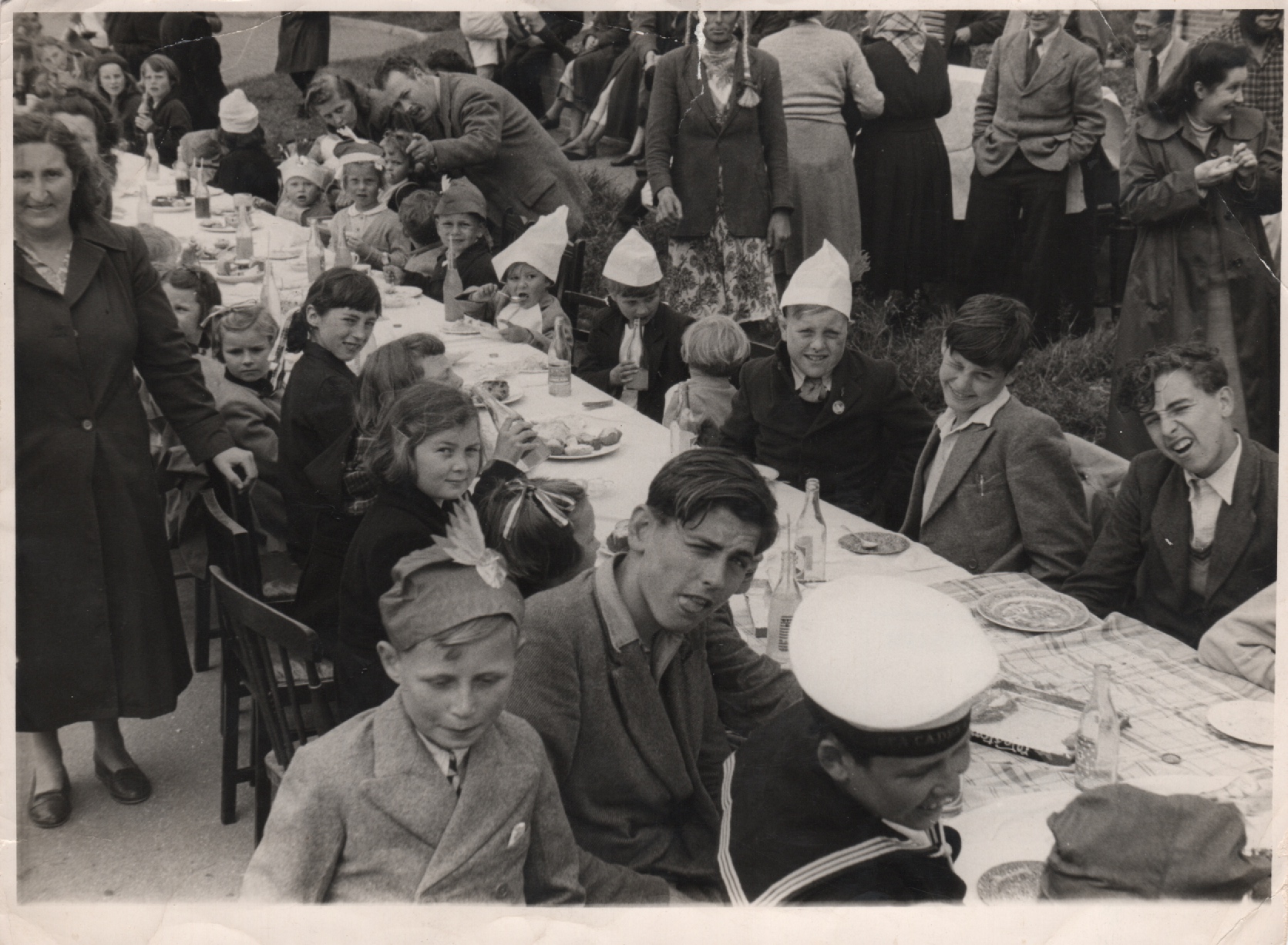 As advised by Carol Lidbetter: "The lady in the dark coat on the left is Mrs Day, I am just to her left with bow in hair, on my left is Linda Andrews and on my right Vera Heard. The gentleman at the top pointing is Mr Dooley and the village policeman's wife is next to him. Mrs Dooley is on the top right of photo and unfortunately I can't remember the cheeky boys in the front - although I do recognise them. Two of them may be the Day boys."