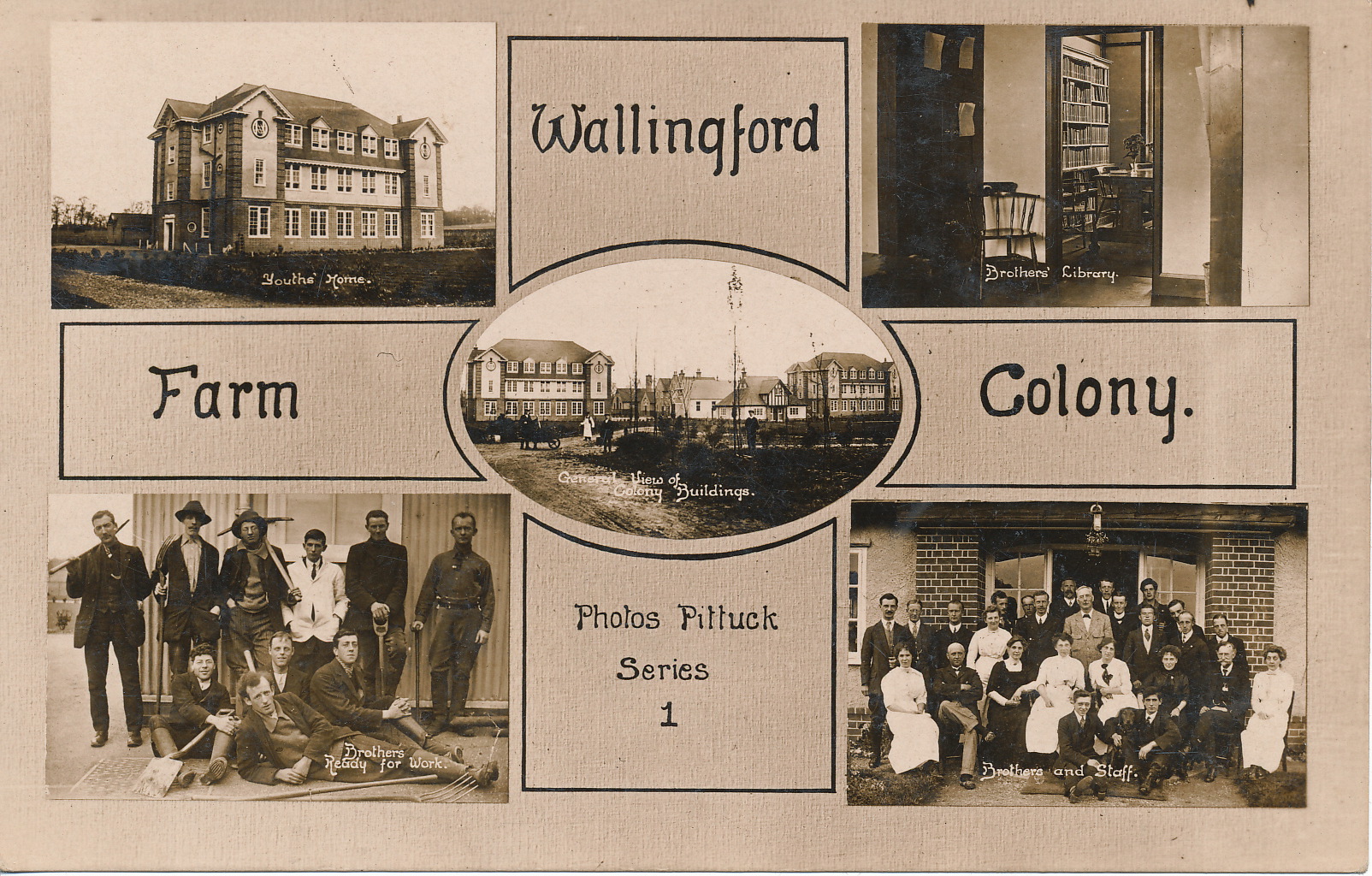 Captions [clockwise from top left] : Youths’ Home, Brothers’ Library, General View of Colony Buildings, Brothers and Staff, Brothers Ready for Work